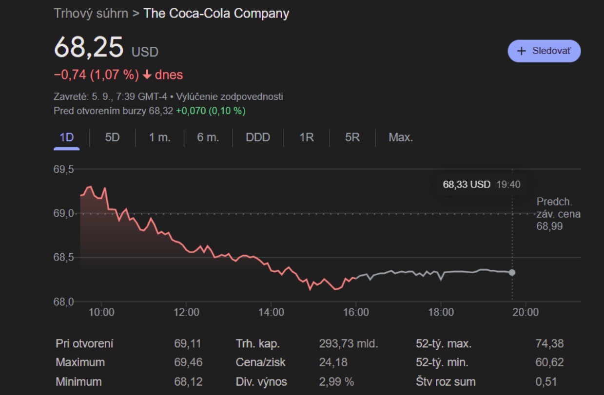 Aktuálna cena týchto akcií sa pohybuje na úrovni 68,25 USD, pričom spoločnosť dosahuje trhovú kapitalizáciu vyše 293 miliárd USD. Do Coca-Cola akcií sa dá jednoducho investovať napr. cez brokerov XTB, eToro, Interactive Brokers.