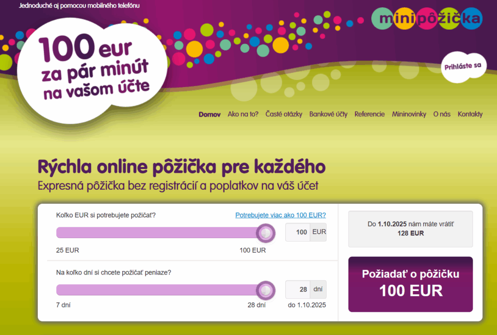 Minipôžička je ideálnym nástrojom pre všetkých, ktorí potrebujú rýchlo menšiu sumu peňazí a nechcú čakať na zdĺhavé schvaľovanie klasických pôžičiek. Vybavenie minipôžičky je jednoduché, bezpečné a úplne online – peniaze môže mať klient k dispozícii už behom niekoľkých minút.